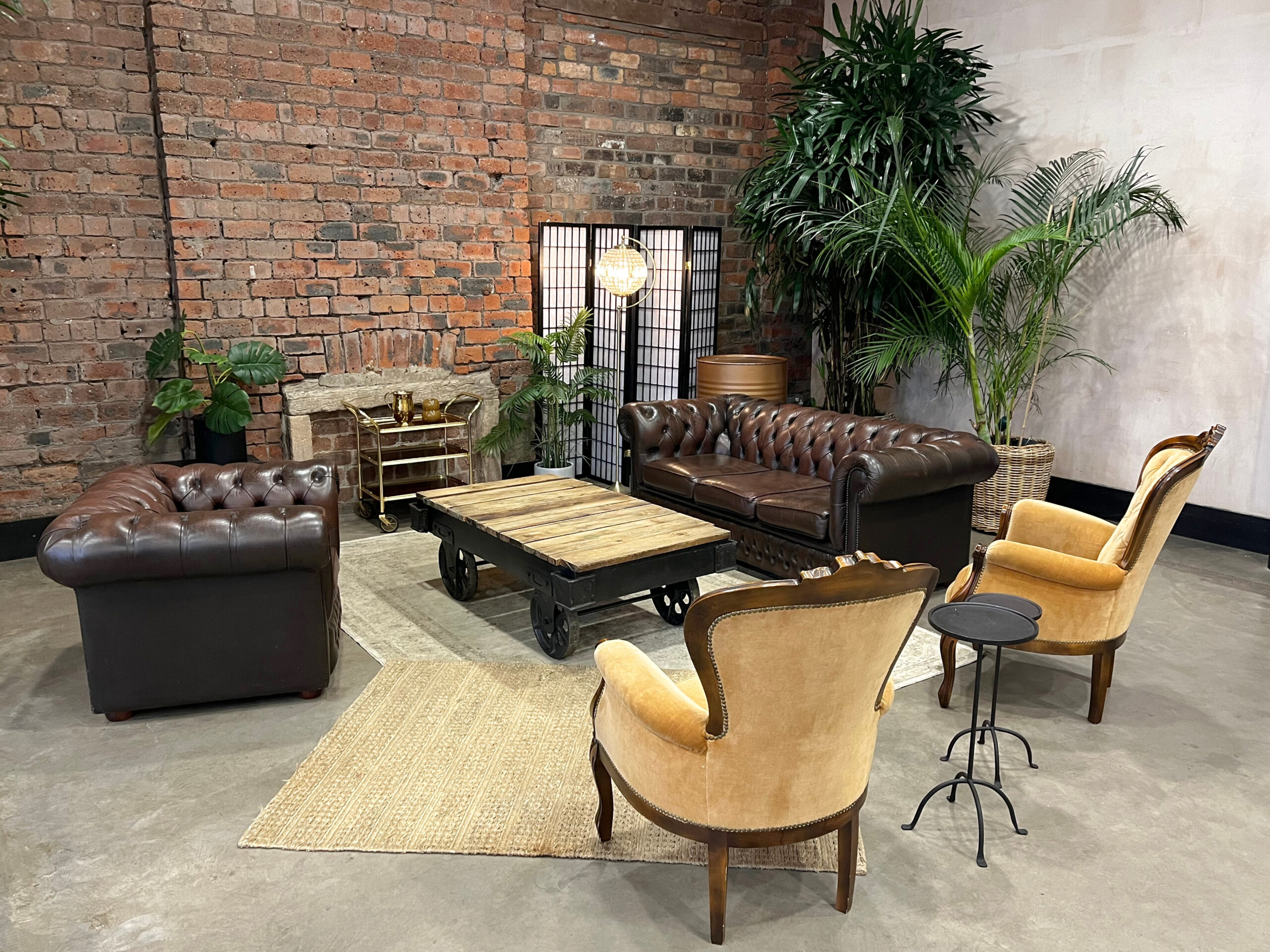 1x Large Chesterfield / 2x Chesterfield Chairs /1x Green Velvet Armchair / 1x Pink Velvet Armchair